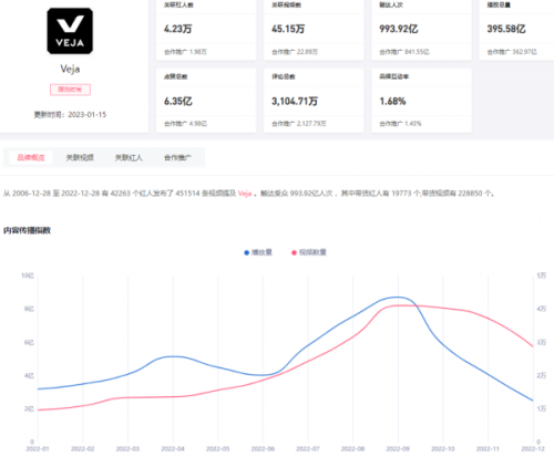 以榜首Veja為例,回望過(guò)去7年里,累計(jì)與42263個(gè)紅人聯(lián)動(dòng),觸達(dá)受眾 993.92億人次 ,其中帶貨紅人有 19773 個(gè),帶貨視頻達(dá) 228850 條,內(nèi)容累計(jì)點(diǎn)贊量達(dá)到6.35億,評(píng)論數(shù)超3000萬(wàn)以上,品牌互動(dòng)率為1.68%。