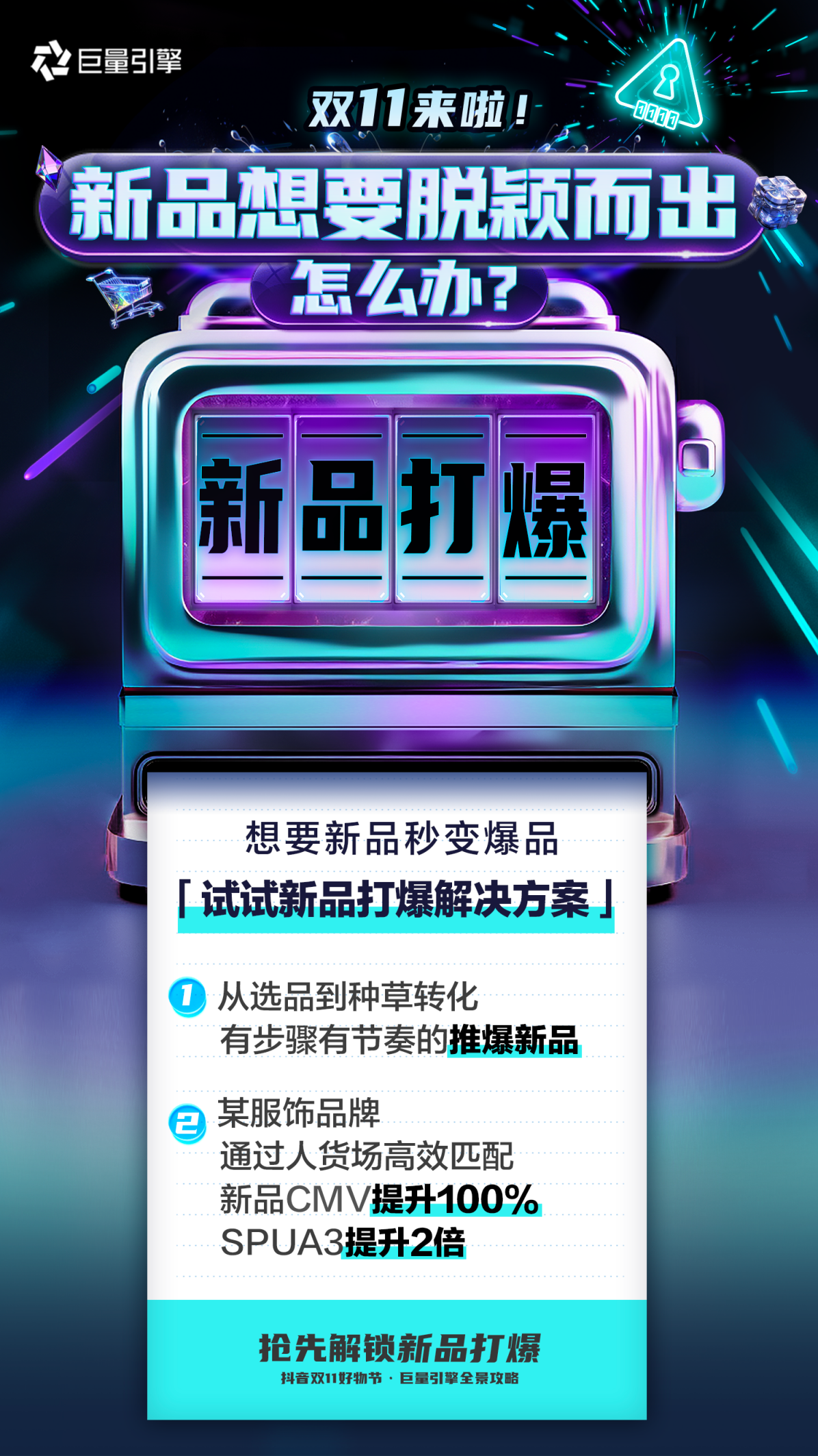 無(wú)論是傳統(tǒng)商業(yè)還是現(xiàn)代電商,貨品永遠(yuǎn)是商業(yè)的核心要素之一,是品牌短期營(yíng)收和長(zhǎng)效發(fā)展的主要?jiǎng)菽?。?duì)待「貨品」的發(fā)力點(diǎn),重在高效的新品發(fā)布舉措與爆款的打造兩方面。許多品牌可能會(huì)覺(jué)得,爆品的出現(xiàn)是偶然的,新品成爆品更是難上加難。從路徑來(lái)看,想把新品打爆,首先,要推出正確且符合用戶期待的新品,其次是將新品打造成爆品,二者每一項(xiàng)都需要“靠運(yùn)氣”。打造爆品似乎是偶然的、是九死一生的。但在抖音上,新品出現(xiàn)了集體崛起的現(xiàn)象,每10分鐘會(huì)誕生出一個(gè)百萬(wàn)級(jí)爆品。雙11作為全年大的購(gòu)物狂歡節(jié),是各品牌新品發(fā)布的重要節(jié)點(diǎn),也是打出爆款的重要契機(jī)。那如何抓住雙11大促契機(jī),讓新品成爆款,讓大促生意更簡(jiǎn)單?