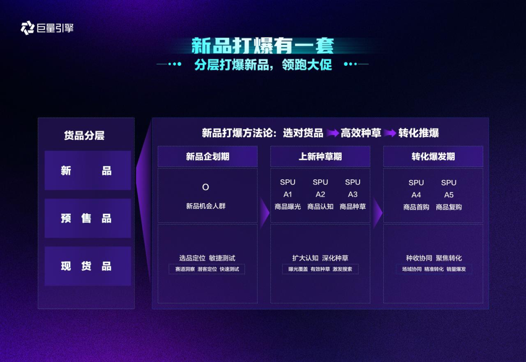 巨量引擎推出「雙11新品打爆方法論」,基于商家新品推爆的實(shí)際需求,從新品企劃、上新種草、轉(zhuǎn)化爆發(fā)三大階段提供能力,讓商家有步驟、有節(jié)奏的推爆新品,幫助品牌商家精準(zhǔn)解決新品推爆難題。