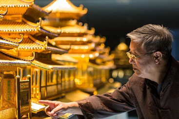 (上:花絲鑲嵌工藝大師姚迎春指導(dǎo)潮宏基“臻寶博物館”鎮(zhèn)館之寶“花絲風(fēng)雨橋”設(shè)計(jì)制作;