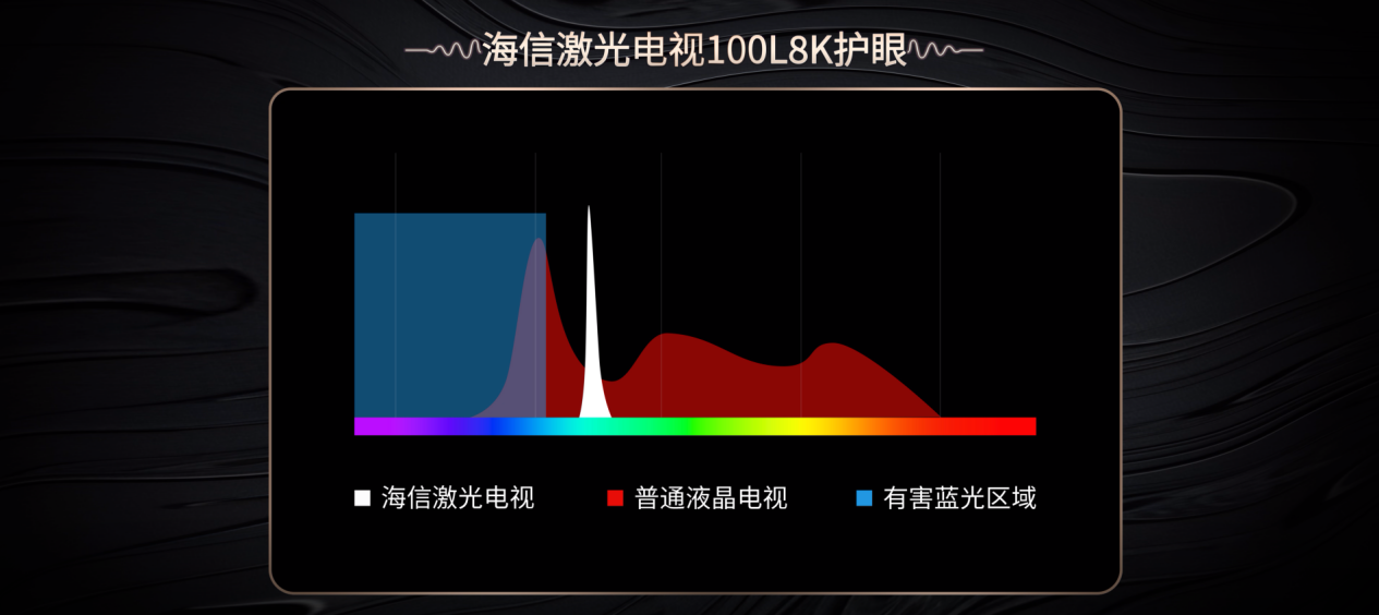 在這個離不開電子設(shè)備的時代,護眼已經(jīng)成為全民關(guān)注的熱點話題。海信100英寸激光電視L8K采用純凈激光光源,避開有害藍光傷害最大的435-445nm波段,從源頭解決用戶最擔(dān)心的有害藍光問題。