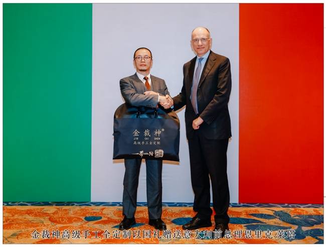 晚宴期間,觥籌交錯,意大利前總理恩里克?萊塔就東、西方文明的碰撞交流、共同發(fā)展等話題,與多位中國企業(yè)家展開深層次的探討。其中,國禮品牌金裁神的服裝一經(jīng)亮相,便吸引恩里克·萊塔的目光,只見他認(rèn)真端詳起來,從袖口到針腳,由質(zhì)地到裁剪,對其精湛手藝贊不絕口,更對“金裁神”的工匠初心給予了高度的贊賞。