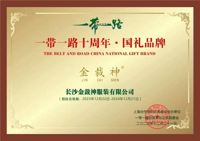眾所周知,“國禮”即以國家元首、政 府的名義進(jìn)行互贈的禮品,代表著國家的產(chǎn)品水準(zhǔn),但凡能夠成為國禮品牌者,無一不是行業(yè)之翹楚。因此,長沙金裁神能夠榮獲“一帶一路十周年?國禮品牌”獎項(xiàng),是品質(zhì)的堅(jiān)守,是初心的不忘,更是品牌與品質(zhì)的有力證明。