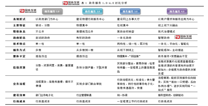 下表將圍繞表現(xiàn)形式、主要特征、職權(quán)體系、政府形態(tài)、技術(shù)特點(diǎn)、服務(wù)方式、整體不足、信息資源、業(yè)務(wù)流程、建設(shè)效果、行政流程11個(gè)方面,對政務(wù)服務(wù)1.0到政務(wù)服務(wù)4.0進(jìn)行對比分析。