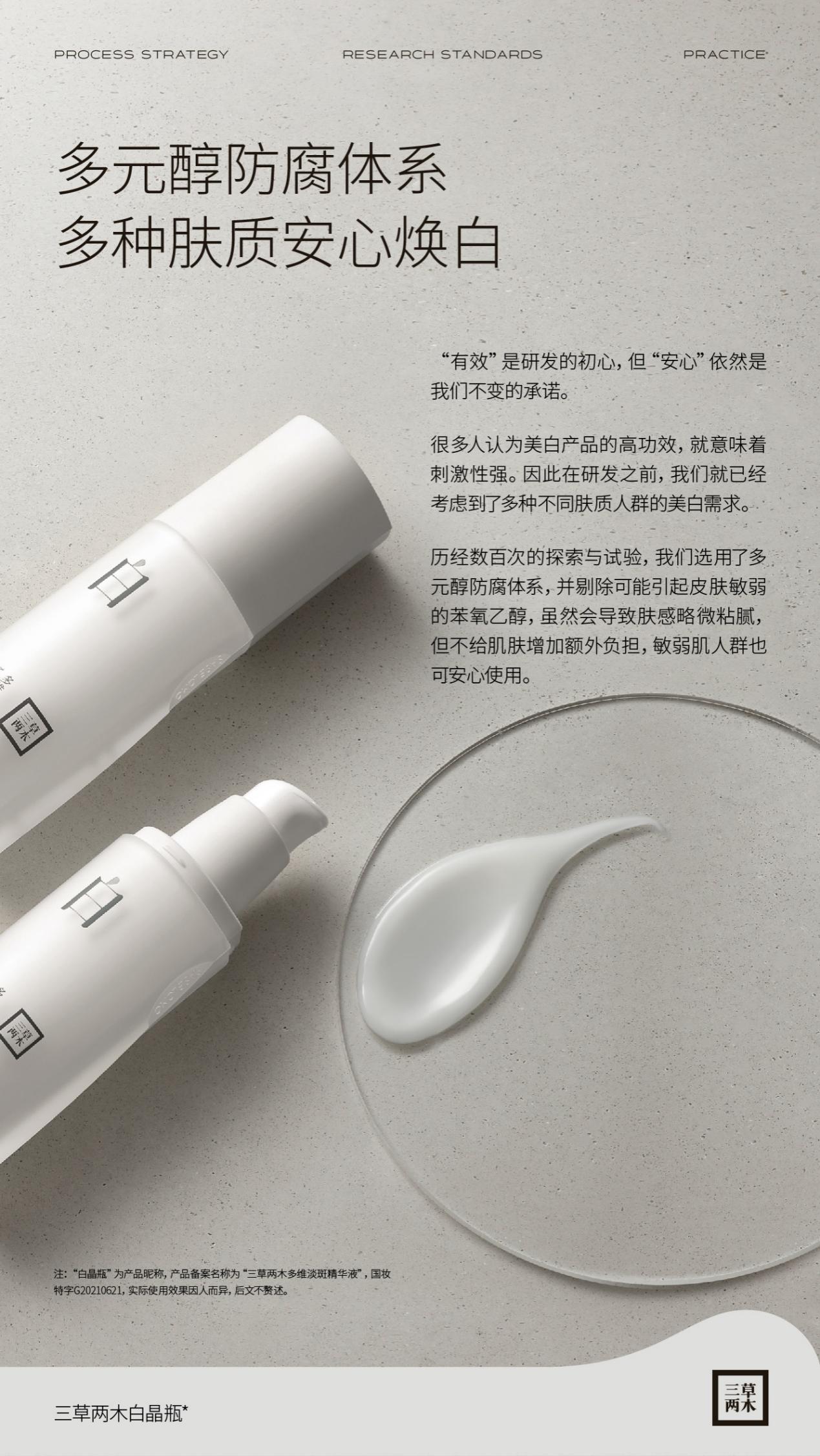 “有效”固然是研發(fā)的初心,但“安心”更是三草兩木不變的承諾。在研發(fā)三草兩木白晶瓶這款產(chǎn)品之前,團(tuán)隊就已經(jīng)考慮到了多種不同膚質(zhì)人群的美白需求,要求產(chǎn)品必須要溫和、安全、無刺激,適合各類膚質(zhì)。為達(dá)到這個目的,團(tuán)隊在經(jīng)歷數(shù)百次探索、試驗后,選用多元醇防腐體系成功解決了安全問題,剔除掉可能引起皮膚敏感、脆弱的苯氧乙醇,實現(xiàn)溫和美白,讓敏感脆弱肌膚人群也可安心使用。