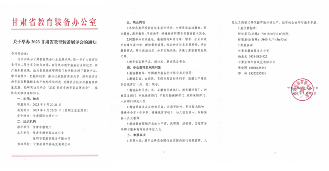 9月22-24日,2023甘肅省教育裝備展示會誠摯邀請全國各地各類教育裝備企業(yè)齊聚蘭州,共享甘肅教育市場無限商機!