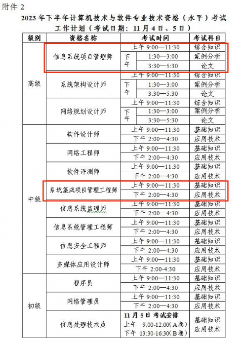 根據(jù)軟考辦發(fā)布的《關(guān)于2023年度計算機技術(shù)與軟件專業(yè)技術(shù)資格(水平)考試工作計劃及有關(guān)事項的通知》可以得知,2023年下半年軟考考試時間為11月4、5日,具體如下表所示:
