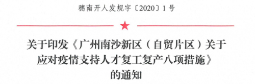 南沙區(qū)人才、科技、人社、住建四部門聯(lián)合印發(fā)《廣州南沙新區(qū)(自貿(mào)片區(qū))關(guān)于應(yīng)對(duì)疫情支持人才復(fù)工復(fù)產(chǎn)八項(xiàng)措施》。