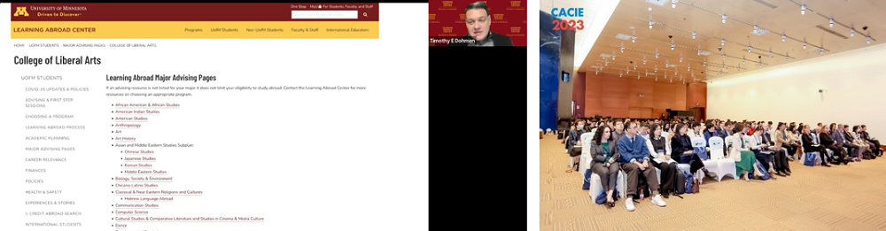 來自明尼蘇達(dá)大學(xué)雙城分校(UMN)海外學(xué)習(xí)融合及外聯(lián)主任 Timothy Dohmen先生遠(yuǎn)程分享了UMN在學(xué)生國際流動和學(xué)科建設(shè)的經(jīng)驗(yàn),尤其從海外學(xué)習(xí)和課程融合的角度來進(jìn)行了相應(yīng)闡述。Timothy先生介紹到,明尼蘇達(dá)大學(xué)雙城分校是明尼蘇達(dá)州的一所研究型大學(xué),雙城校區(qū)在校本科生30000人,70%的生源是來自明尼蘇達(dá)州的本土學(xué)生,不同專業(yè)方向的學(xué)院分別坐落在5個不同校區(qū)。