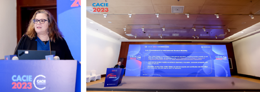 最后,費(fèi)曼舒女士向大家介紹了美國交流學(xué)習(xí)簽證的新動向。在2023年中,美國大使館和美國駐世界各地的使領(lǐng)館,已經(jīng)向中國的學(xué)生、學(xué)者及其家屬簽發(fā)了9萬多份簽證,比上一年增加了2.3萬多份,并且到年底前還會增加更多。