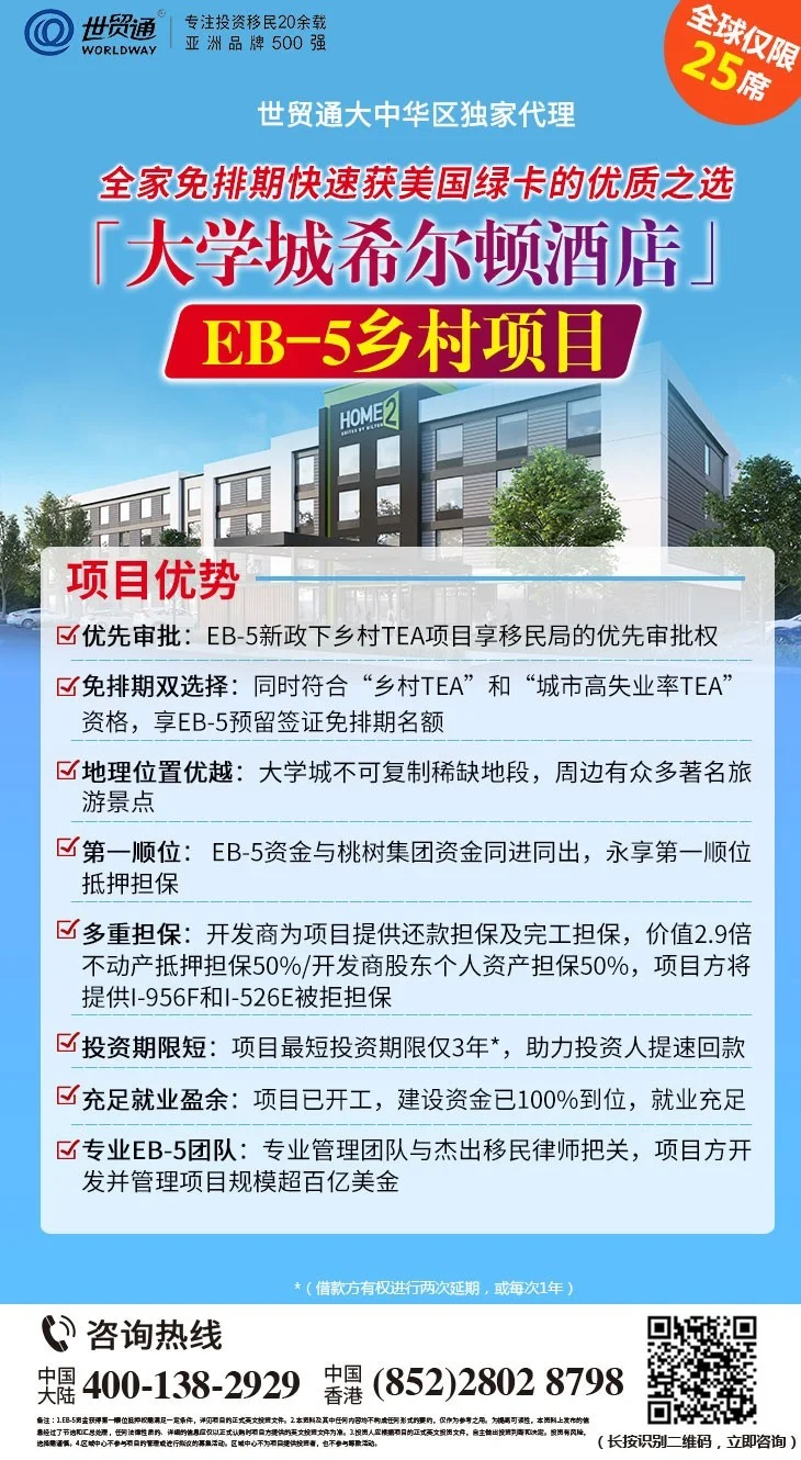 由世貿(mào)通集團(tuán)擔(dān)任大中華區(qū)獨(dú)家代理的「大學(xué)城希爾頓酒店」EB-5鄉(xiāng)村項(xiàng)目,具有優(yōu)先審批、免排期、價(jià)值2.9倍不動(dòng)產(chǎn)抵押擔(dān)保50%/開發(fā)商個(gè)人資產(chǎn)擔(dān)保50%、EB-5資金與桃樹集團(tuán)同進(jìn)同出,永享第 一順位抵押擔(dān)保、大學(xué)城不可復(fù)制稀缺地段、最短投資期僅3年、同時(shí)符合“鄉(xiāng)村TEA”和“城市高失業(yè)率TEA”資格等多重優(yōu)勢(shì),項(xiàng)目全球僅限25席,名額不多,有意向者認(rèn)購(gòu)需從速!