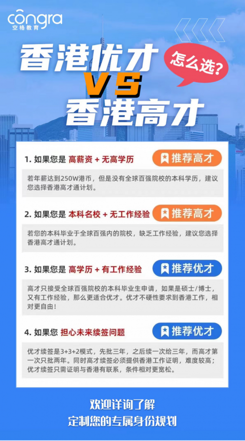 摘要:香港優(yōu)才計劃和高才通怎么選?不同的背景人群適合不同的方式!十年專注香港身份,空格教育為您提供全方位、個性化的指導(dǎo)和支持,量身定制合適的方案!