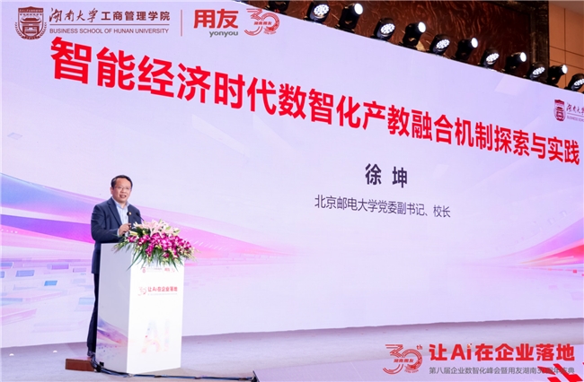 會上,北京郵電大學黨委副書記、校長徐坤以《智能經(jīng)濟時代數(shù)智化產(chǎn)教融合機制探索與實踐》為題,從高等教育與產(chǎn)業(yè)發(fā)展融合的視角出發(fā),深入探討了在智能經(jīng)濟時代背景下,如何通過產(chǎn)教融合機制的創(chuàng)新,培養(yǎng)適應數(shù)智化轉型需求的復合型人才,為企業(yè)的高質量發(fā)展提供智力支撐。他指出,智能經(jīng)濟時代亟需推動產(chǎn)教融合從“協(xié)議式合作”向“內(nèi)生式共建”轉變。他提出以教育智聯(lián)網(wǎng)為核心,構建“云邊端、大中小”模型協(xié)同的數(shù)智教育公共服務體系,打破教與學、學與用的邊界壁壘,實現(xiàn)學校小課堂、社會大課堂與產(chǎn)業(yè)真課堂的深度融合。徐坤表示,未來期待與用友及更多企業(yè)攜手,打造數(shù)智化產(chǎn)教融合典型示范,促進資源聯(lián)動共享,為校企雙方在應對未來“不確定性”中提供可預期的“確定性”路徑。