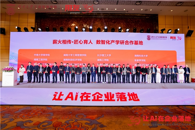 3月26日,在湖南省工信廳、湖南省國資委指導下,由用友聯(lián)合湖南大學工商管理學院共同主辦,湖南大學工商管理學院EE中心、長沙市企業(yè)服務中心、中國農(nóng)業(yè)銀行股份有限公司長沙分行、新道科技股份有限公司、北京用友政務軟件股份有限公司、暢捷通信息技術股份有限公司協(xié)辦的“讓AI在企業(yè)落地”第八屆企業(yè)數(shù)智化峰會在湖南長沙隆重召開。會上,用友新道聯(lián)合16所院校共建的2026 年(湖南)數(shù)智化產(chǎn)學研合作創(chuàng)新基地正式啟動,用友網(wǎng)絡董事長兼CEO王文京為基地院校授牌,開啟湘域數(shù)智化產(chǎn)教融合新征程。