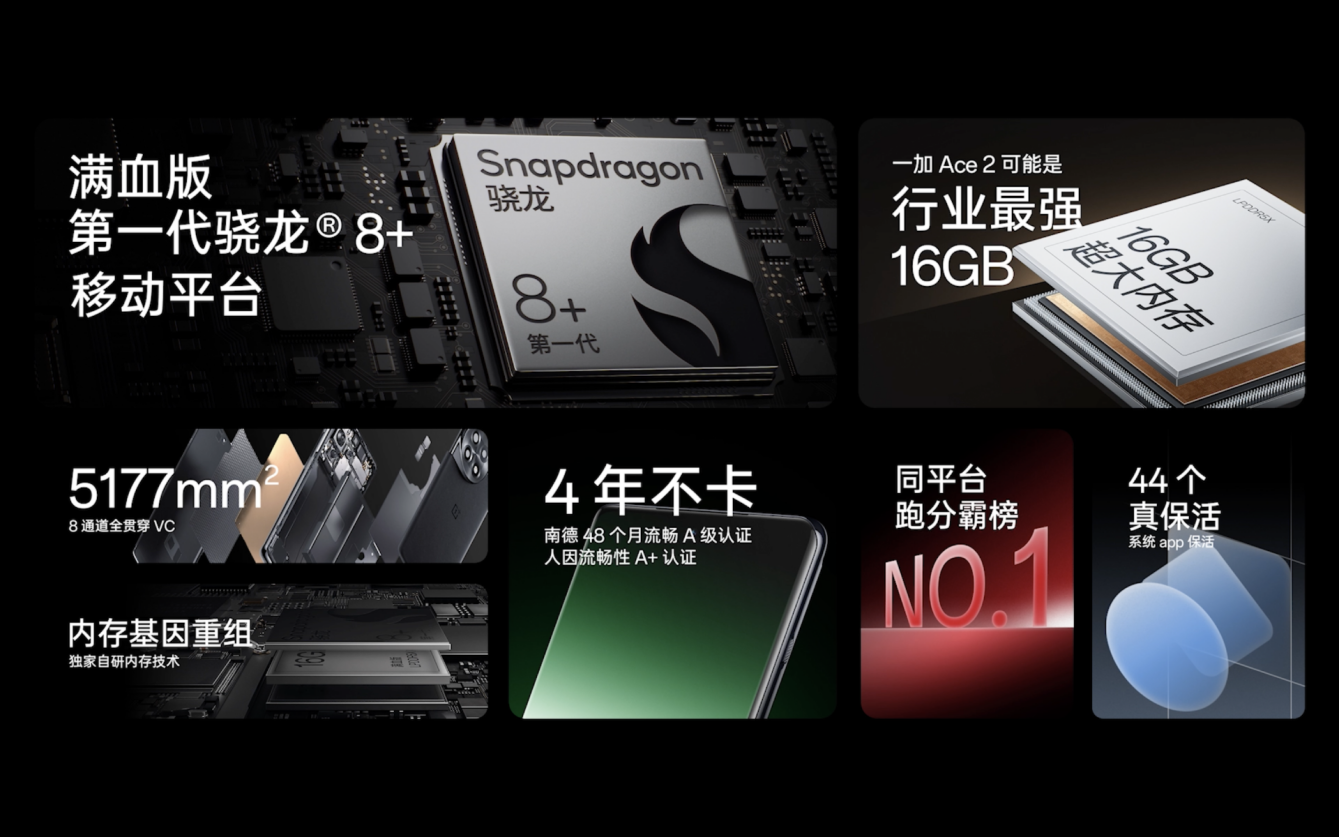 一加 Ace 2為用戶帶來同價(jià)位段前所未見的性能釋放:搭載滿血版驍龍8+ 移動(dòng)平臺 + LPDDR5X + UFS3.1的組合,安兔兔跑分高達(dá) 1149494 分,刷新驍龍8+ 移動(dòng)平臺最 高紀(jì)錄。內(nèi)存配置上,一加 Ace 2繼續(xù)堅(jiān)持“大內(nèi)存普及”思路,12GB+256GB 起步,至高支持 16GB+512GB,性能釋放領(lǐng) 先一步。配合獨(dú)家自研的內(nèi)存基因重組技術(shù),一加 Ace 2 重負(fù)載場景丟幀次數(shù)降低 50%,后臺應(yīng)用駐留最多達(dá) 44 個(gè),后臺駐留能力成為同平臺第一。同時(shí),一加 Ace 2 還獲得南德 48 個(gè)月 A 級流暢認(rèn)證及 SGS 人因流暢性 A+ 認(rèn)證。