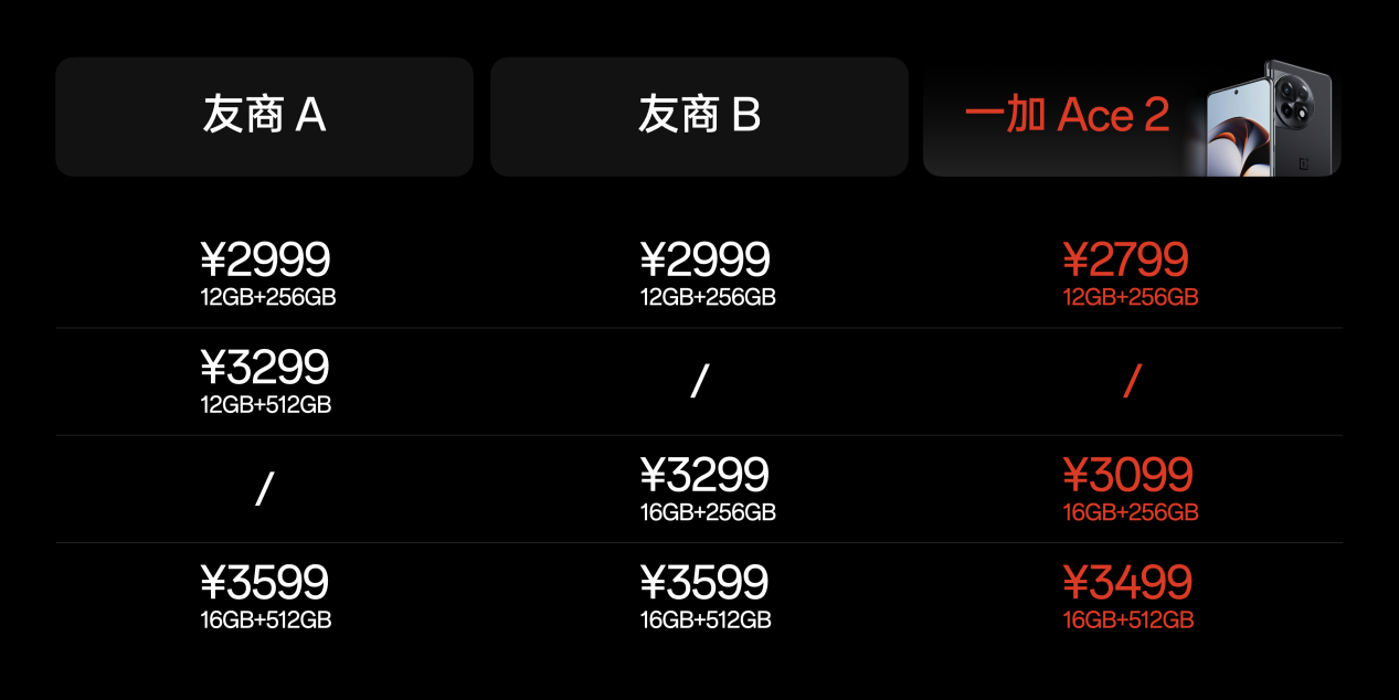 一加 Ace 2 16GB + 256GB 版本,售價(jià)3099元;