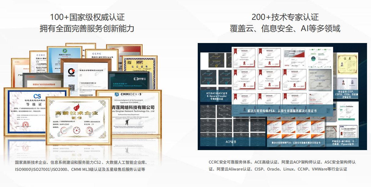 通過持續(xù)的技術(shù)服務(wù)創(chuàng)新,青蓮網(wǎng)絡(luò)獲得國家高新技術(shù)企業(yè)、五星級售后服務(wù)認(rèn)證、中國信通院首批云優(yōu)化能力提升計劃成員、阿里云旗艦級合作伙伴、廣東省CIO優(yōu)秀云服務(wù)商等多項行業(yè)認(rèn)證、技術(shù)專利和榮譽(yù)稱號。