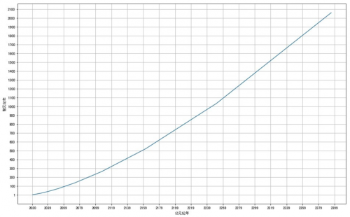 例如:人類公元紀(jì)年法的第5年對(duì)應(yīng)機(jī)器智元紀(jì)年法的第20年,人類公元紀(jì)年法的第6年對(duì)應(yīng)機(jī)器智元紀(jì)年法的第37年,以此類推。根據(jù)中國(guó)的劉慈欣的《三體》小說,本圖形只推演了人類的公元2400年。