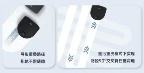 掃地機器人最不能缺少的就是算法,算法是決定一個掃地機器人能否將一間屋子打掃得一塵不染的關鍵,V7洗地機器人在算法上再次大膽嘗試創(chuàng)新,在洗地模式下弓形重疊路徑,配合雙滾筒刷能夠保證不留縫隙,在重污重洗的模式下,創(chuàng)新了CIMA算法,這個算法能夠讓洗地機器人以90o交叉重復拖地兩次,實現(xiàn)了全方位的清潔。