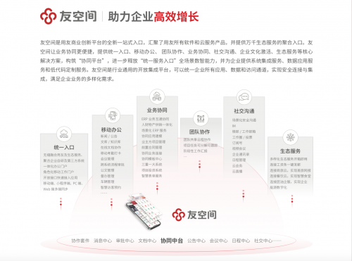 友空間還大力擴(kuò)展生態(tài)建設(shè)和數(shù)據(jù)應(yīng)用服務(wù),抓準(zhǔn)了巨大存量企業(yè)客戶與增量客戶數(shù)字化轉(zhuǎn)型的需求,解決從基礎(chǔ)設(shè)施,到云上轉(zhuǎn)型,到運(yùn)營管理升級全過程的組織數(shù)智化變革問題。結(jié)合企業(yè)需求和行業(yè)理解,為企業(yè)提供一站式綜合解決方案,實現(xiàn)“開箱即用”。