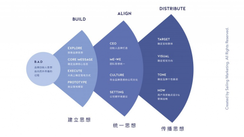先說結(jié)論,品牌打造和落地的核心理念是:一、BUILD建立思想(品牌戰(zhàn)略);二、ALIGN統(tǒng)一思想(內(nèi)部文化);三、DISTRIBUTE傳播思想(營銷戰(zhàn)略)。
