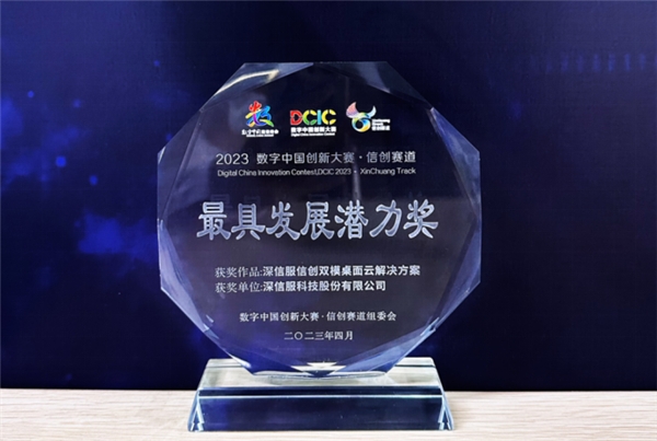 在“2023數(shù)字中國創(chuàng)新大賽·信創(chuàng)賽道”中,深信服信創(chuàng)雙模桌面云解決方案榮獲最具發(fā)展?jié)摿Κ?jiǎng)(全國僅10個(gè))。