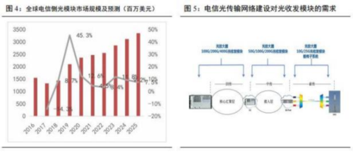 從光模塊下游市場來看,1 ) 電信市場是光模塊的發(fā)源場景,需求保持穩(wěn)中有增 。一方面 , 電信用光模塊主要集中在前傳 ,對光模塊速率要求低且產(chǎn)品迭 代速率慢,三大運營商計劃將資本開支逐漸傾斜于云計算等算力網(wǎng)絡(luò)場景; 另一方面 ,光纖入戶規(guī)模擴大與速率向 10G PON 升級助推光模塊需求; 2 ) 數(shù)通市場是光模塊主要市場且發(fā)展迅速 。數(shù)據(jù)中心流量增加和網(wǎng)絡(luò)架構(gòu)由傳統(tǒng)架構(gòu)轉(zhuǎn)變?yōu)槿~脊網(wǎng)絡(luò)架構(gòu)推動光模塊數(shù)量和速率快速提高。目前光模塊正處于向 800G 速率發(fā)展的新周期。