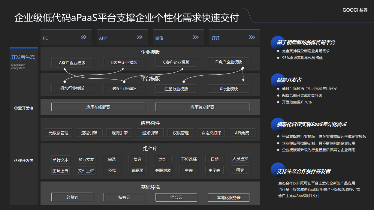 作為國內(nèi)第 一、通過SaaS+低代碼開發(fā)的企業(yè)數(shù)字化轉(zhuǎn)型解決方案服務(wù)商,谷器數(shù)據(jù)在促進(jìn)低代碼開發(fā)平臺在制造領(lǐng)域規(guī)?;瘧?yīng)用的方向毅力前行,上線低代碼開發(fā)平臺,使得業(yè)務(wù)人員通過低代碼平臺配備頁面編輯器上的元素、樣式、組件自由編輯頁面,按需搭建個性化數(shù)字化應(yīng)用,滿足業(yè)務(wù)需求。另外,谷器低代碼開發(fā)平臺提供海量的行業(yè)組件庫,僅需通過組件配置的方式,在方便應(yīng)用開發(fā)的同時,構(gòu)建組件開發(fā)者生態(tài),持續(xù)豐富組件庫,保持應(yīng)用具備強擴(kuò)展性、延續(xù)性,持續(xù)滿足企業(yè)數(shù)字化升級需求,并為行業(yè)提供成熟模板,加速產(chǎn)業(yè)數(shù)字化轉(zhuǎn)型步伐。