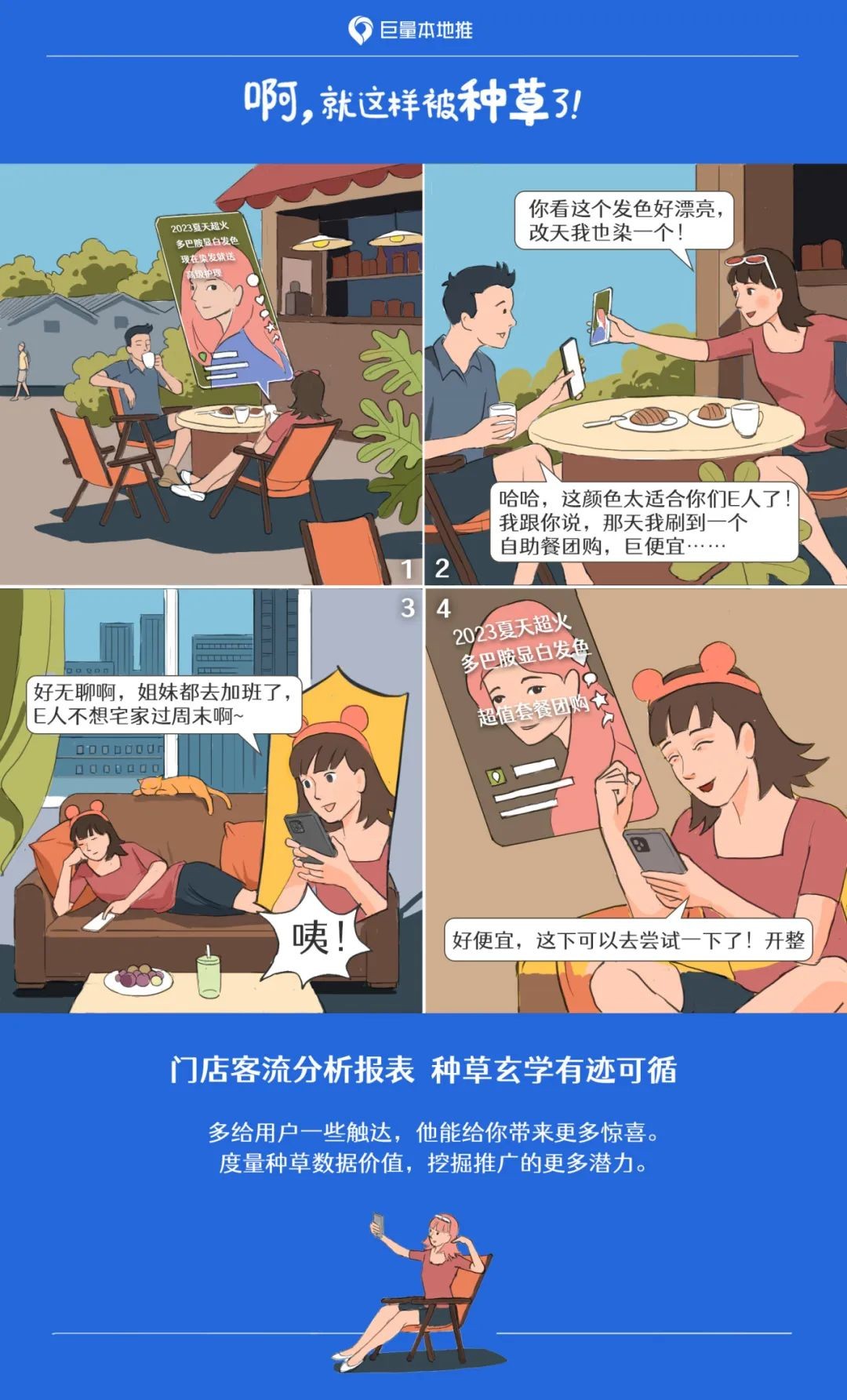比如漫畫中的女生被一條短視頻“種草”了美發(fā)店,但因為跟朋友聊天轉(zhuǎn)移了注意力,沒有當(dāng)時團購下單,卻又在一個無所事事的周末,再次刷到這家美發(fā)店,這次女生果斷下單團購到店消費。這樣一來,這位女生就被計入了「門店客流分析」報表中,我們可以以此為依據(jù),進一步去轉(zhuǎn)化像漫畫中的女生這樣的消費者,或者擴大我們的“種草人群”。
