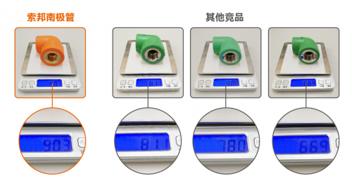 從材料上看,南極管的生產(chǎn)標(biāo)準(zhǔn)遠(yuǎn)遠(yuǎn)超過國家標(biāo)準(zhǔn),納米層厚度是普通管納米層的5倍,總壁厚超過國標(biāo)厚度0.6-0.8mm,和其他品牌管對比更是肉眼可見。除了管壁超厚外還超重,以同規(guī)格內(nèi)絲彎頭稱重實驗,南極管比其他品牌管重15