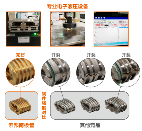 南極管采用特殊工藝,將熔融的塑料強有力的注入槽內(nèi),鑲嵌更牢固,杜絕了脫落、滲漏現(xiàn)象。管件采用62#銅材質(zhì),韌性強,承壓能力好,即便在壓力值10106N測試下,依然完好無損。