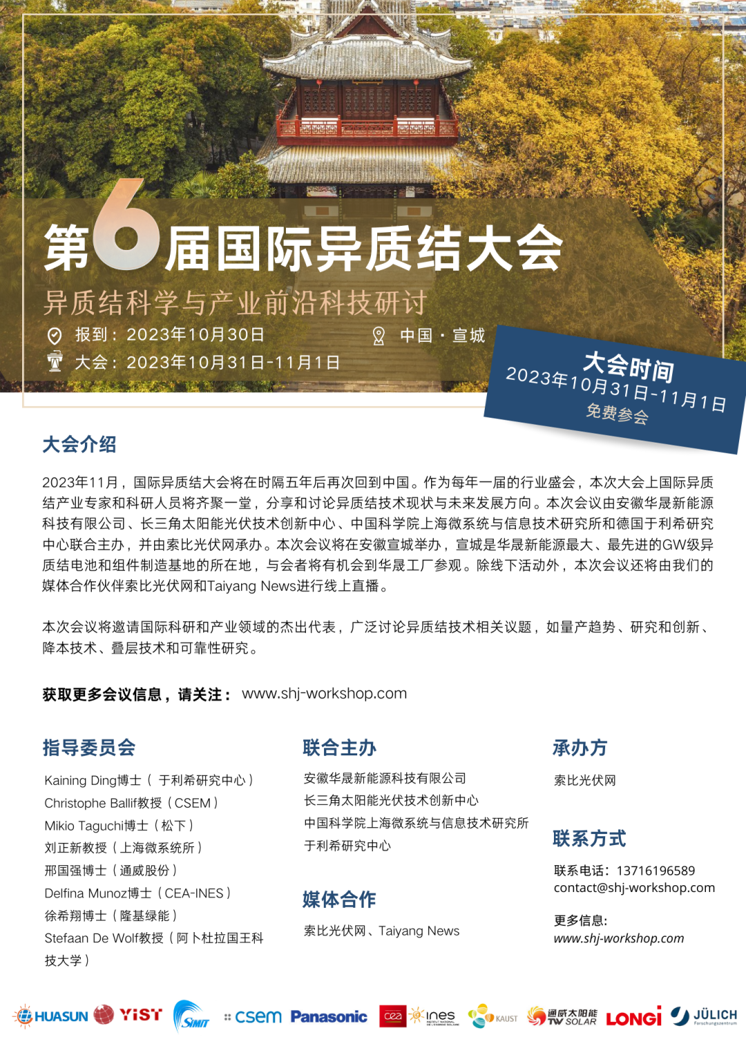 2023年10月31日至11月1日,第六屆國際硅異質結研討會將來到中國異質結光伏之都——安徽省宣城市。本次會議由全球領 先的異質結垂直一體化產品與解決方案提供商安徽華晟新能源科技有限公司與長三角太陽能光伏技術創(chuàng)新中心、中國科學院上海微系統(tǒng)與信息技術研究所、德國于利希研究中心聯(lián)合主辦,索比網承辦。