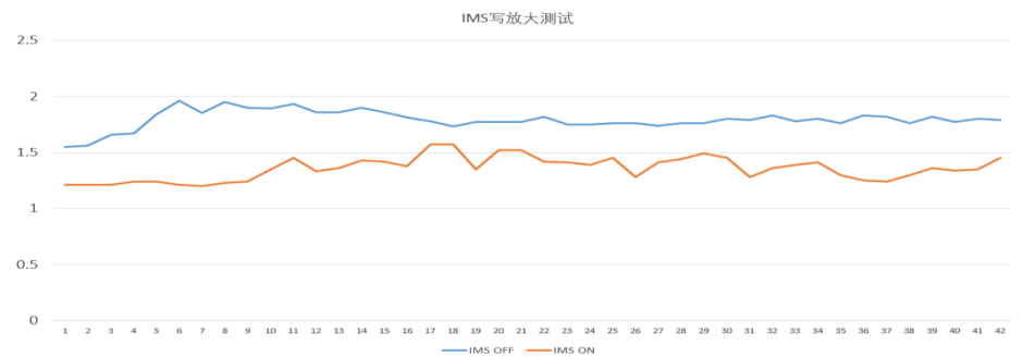 在 Ceph 方案中,基于標準 JESD 219 業(yè)務模型,針對 SSD 分別開啟、關閉智能多流進行寫放大測試,通過圖 7 對比驗證結(jié)果可以看到憶聯(lián)智能多流(IMS)開啟后,SSD 寫放大降低 20%+,極大提升了 SSD 壽命。