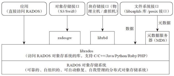 Ceph 主要分為應用接口層、存儲基礎接口層、存儲對象層。接口層主要負責客戶端訪問,分為本地語言綁定接口、塊存儲設備接口和文件系統(tǒng)接口,展現(xiàn)了 Ceph 統(tǒng)一性。