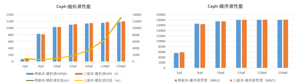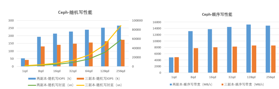 如圖 5 所示,不論是在隨機寫還是在順序?qū)憳I(yè)務下,二副本寫性能遠高于三副本性能,主要是由于副本復制帶來的網(wǎng)絡及存儲開銷,造成三副本寫帶寬及寫 IOPS 下降明顯。在總體時延表現(xiàn)上,二副本明顯優(yōu)于三副本。在時延變化趨勢上,二副本與三副本基本一致,皆在 32QD 后有比較顯著的上升。