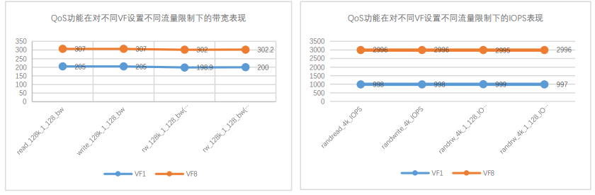 圖 2:QoS 功能在對不同 VF 設(shè)置不同流量限制下的帶寬及 IOPS 表現(xiàn)