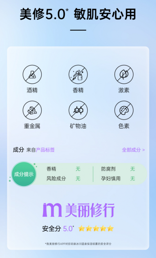 作為彌玥泉家的王牌產(chǎn)品,彌玥泉噴霧用料一點也不含糊,100%冰川溫泉水成分添加,不含酒精香精防腐劑,美麗修行安全分5.0,上臉溫和舒適,哪怕是肌膚非常脆弱的狀態(tài)噴,都不會感覺有任何的刺激。