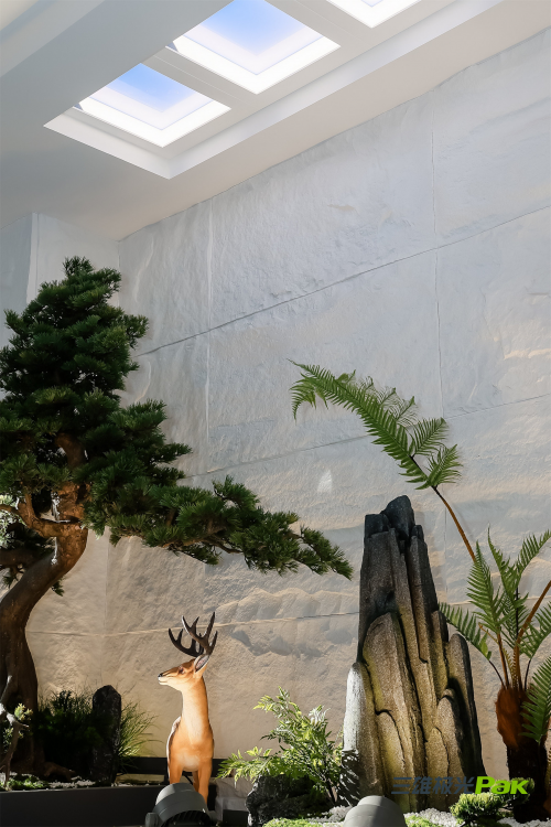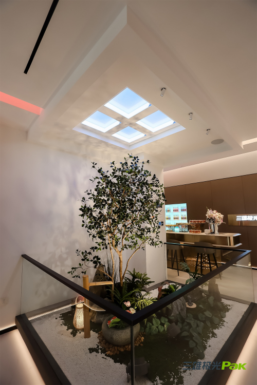 在場景體驗(yàn)上,三雄極光智能照明品牌館 (上海)下足功夫。兩處造景由三雄極光創(chuàng)新黑科技CAF Lighting 蔚藍(lán)燈、戶外燈具及自然植被共同構(gòu)成,形成別有洞天的效果,迅速在來訪者腦海中形成記憶點(diǎn),印下三雄極光“光健康”的品牌理念。