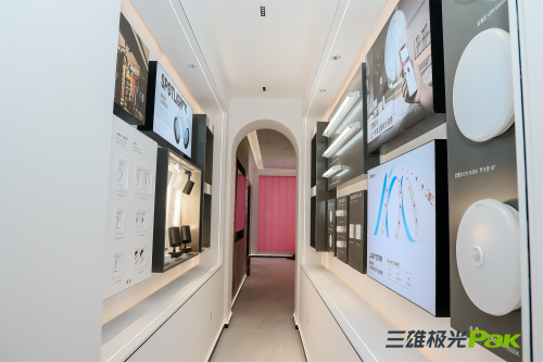 步入三雄極光智能照明品牌館 (上海),三雄極光三十余年發(fā)展歷程映入眼簾,專業(yè)圖文資料和三雄極光優(yōu)質(zhì)產(chǎn)品逐漸展現(xiàn)在來訪者的視野之內(nèi),強(qiáng)而有力地傳遞品牌兩大核心關(guān)鍵詞:“智能”與“健康”。洄游動線串聯(lián)起不同功能分區(qū),布置靈活的墻體使功能各異的區(qū)域既有連接又相對獨(dú)立,創(chuàng)造若分若合、若斷若續(xù)的層次感,帶領(lǐng)來訪者逐步深入地了解三雄極光在健康智能照明領(lǐng)域的專業(yè)與實(shí)力。