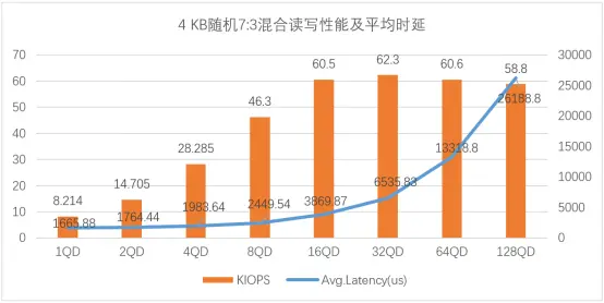 如圖4所示,在4KB隨機7:3混合讀寫性能場景中,UH711a在32QD及以下更具優(yōu)勢,IOPS峰值在32QD時可達(dá)62.3K,對應(yīng)平均時延為6535.83 us(6.5ms[ 1ms=1000 us。])。當(dāng)隊列深度大于32QD時,IOPS呈下降趨勢,平均時延顯著增加。