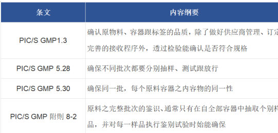 根據(jù)PIC/S GMP法規(guī),我們必需對(duì)藥品之原物料進(jìn)行檢驗(yàn),以確保標(biāo)簽、批次、同一性、抽樣,整理如下表: