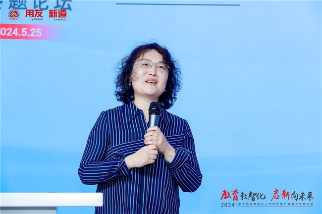 北方工業(yè)大學(xué)教務(wù)處副處長、數(shù)字產(chǎn)業(yè)學(xué)院副院長徐繼寧發(fā)表題為“數(shù)智應(yīng)用‘高素質(zhì)應(yīng)用型’人才培養(yǎng)——數(shù)字產(chǎn)業(yè)學(xué)院建設(shè)探索”的主題演講。她介紹,北方工業(yè)大學(xué)“數(shù)字產(chǎn)業(yè)學(xué)院”,立足北京數(shù)字技術(shù)的創(chuàng)新策源地,支持學(xué)校高水應(yīng)用型大學(xué)建設(shè),產(chǎn)業(yè)學(xué)院建設(shè)具備4個基本特征,分別是產(chǎn)業(yè)需求為導(dǎo)向、跨專業(yè)合作為特征、項目制為載體、學(xué)生發(fā)展為中心。在這個基礎(chǔ)上,“數(shù)字產(chǎn)業(yè)學(xué)院”以云景融合和項目驅(qū)動為抓手,攜手用友新道和眾多合作企業(yè),分別在校內(nèi)建了校企聯(lián)合場景化實驗室,并開展產(chǎn)教融合項目工程實踐,在產(chǎn)科教融合和數(shù)字化轉(zhuǎn)型雙輪驅(qū)動下,為社會培養(yǎng)未來能夠引領(lǐng)或服務(wù)產(chǎn)業(yè)數(shù)字化轉(zhuǎn)型的高素質(zhì)應(yīng)用型人才。