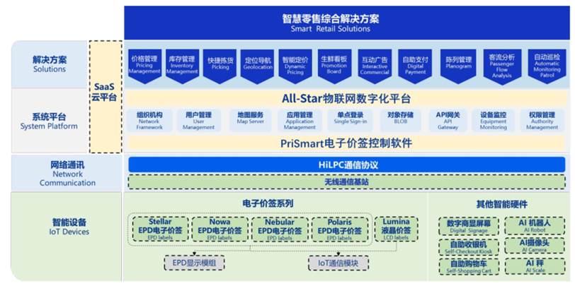 圍繞零售門(mén)店數(shù)字化領(lǐng)域,漢朔科技構(gòu)建了以電子價(jià)簽系統(tǒng)、SaaS云平臺(tái)服務(wù)等軟硬件產(chǎn)品及服務(wù)為核心的業(yè)務(wù)體系,面向零售行業(yè)客戶提供電子價(jià)簽系統(tǒng)等軟硬件一體化解決方案。