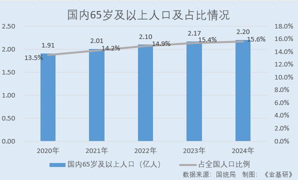 另?yè)?jù)國(guó)統(tǒng)局?jǐn)?shù)據(jù),2020-2024年,國(guó)內(nèi)65歲及以上人口分別為1.91億人、2.01億人、2.10億人、2.17億人、2.20億人,占當(dāng)年度全國(guó)人口的比例分別為13.5%、14.2%、14.9%、15.4%、15.6%。
