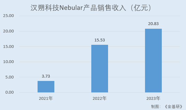 2020年,漢朔科技成功推出的新一代電子價(jià)簽Nebular獲得市場(chǎng)客戶的廣泛認(rèn)可。2020-2023 年,漢朔科技Nebular產(chǎn)品銷(xiāo)售收入分別為0.10億元、3.73億元、15.53億元、20.83億元,年均復(fù)合增長(zhǎng)率達(dá)到487.21%,占主營(yíng)業(yè)務(wù)收入比例從0.95%增長(zhǎng)至55.18%。