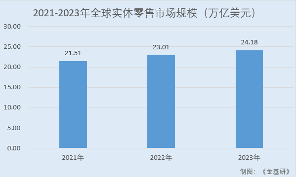 據(jù)eMarketer數(shù)據(jù),2021-2023年,全球?qū)嶓w零售業(yè)市場(chǎng)規(guī)模分別為21.51萬(wàn)億美元、23.01萬(wàn)億美元、24.18萬(wàn)億美元。隨著經(jīng)濟(jì)生活常態(tài)化,未來(lái)全球?qū)嶓w零售業(yè)市場(chǎng)規(guī)模增幅將逐步恢復(fù)平穩(wěn),eMarketer預(yù)計(jì)2023-2027年間復(fù)合增長(zhǎng)率約3%。