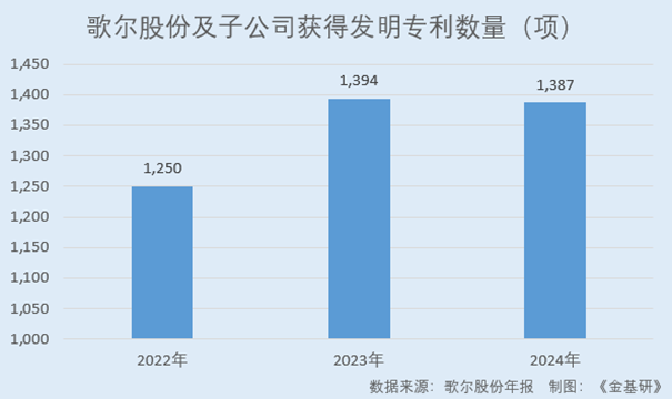 依托持續(xù)的研發(fā)投入、技術(shù)人才隊(duì)伍、多種技術(shù)融合平臺(tái),歌爾股份的研發(fā)成果豐碩,連續(xù)三年獲得發(fā)明專利超1,200項(xiàng)。