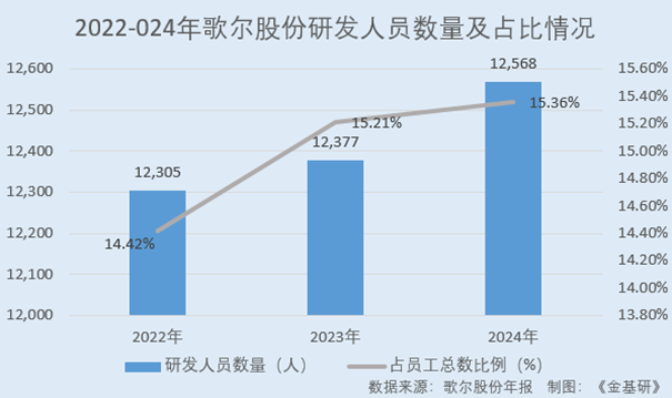 2022-2024年,歌爾股份擁有研發(fā)人員分別為12,305人、12,377人、12,568人,占員工總數(shù)的比例分別為14.42%、15.21%、15.36%。其中,2024年,歌爾股份研發(fā)人員均為本科及以上學(xué)歷,包括博士學(xué)歷75人、碩士學(xué)歷2,797人、本科學(xué)歷8,136人。