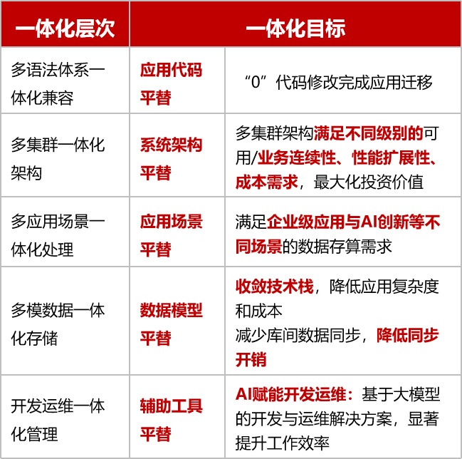 多應用場景一體化處理:打破TP/AP的傳統(tǒng)藩籬。數(shù)據(jù)庫需同時應對交易處理(TP)、分析處理(AP),并進一步細化支撐時序分析、日志處理、AI推理等新興場景。融合架構(gòu)確?!耙粋€平臺,支持多種場景”,避免業(yè)務割裂。