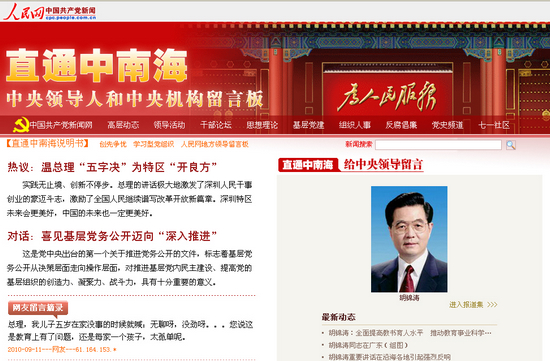 記者從人民網(wǎng)獲悉,人民網(wǎng)、中國共產(chǎn)黨新聞網(wǎng)近日(9月8日)正式推出“直通中南海——中央領(lǐng)導(dǎo)人和中央機(jī)構(gòu)留言板”欄目。網(wǎng)友可以在該欄目上給胡錦濤、溫家寶等中央領(lǐng)導(dǎo)人留言。